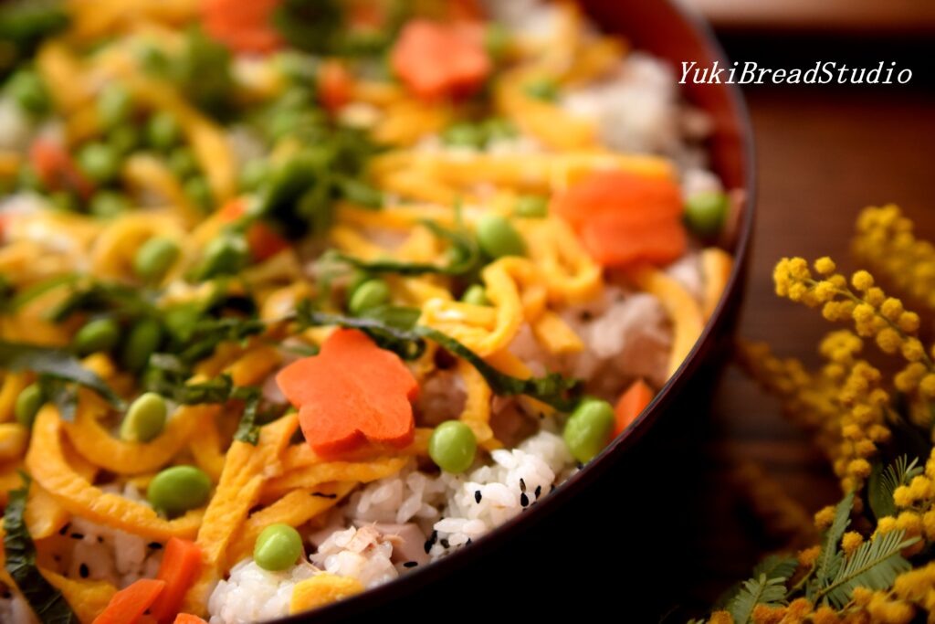 3月に入りました~💕今朝は、たった今花のパン(形いろいろ。桜あんバージョンと私が作ったあんこ+クリームチーズバージョン)そして、家にあるもので作ったちらし寿司完成~