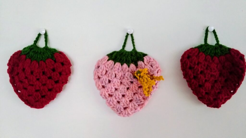 いちごのアクリルたわし(ミモザは、本物)かわいい~~~に最近目がいく。